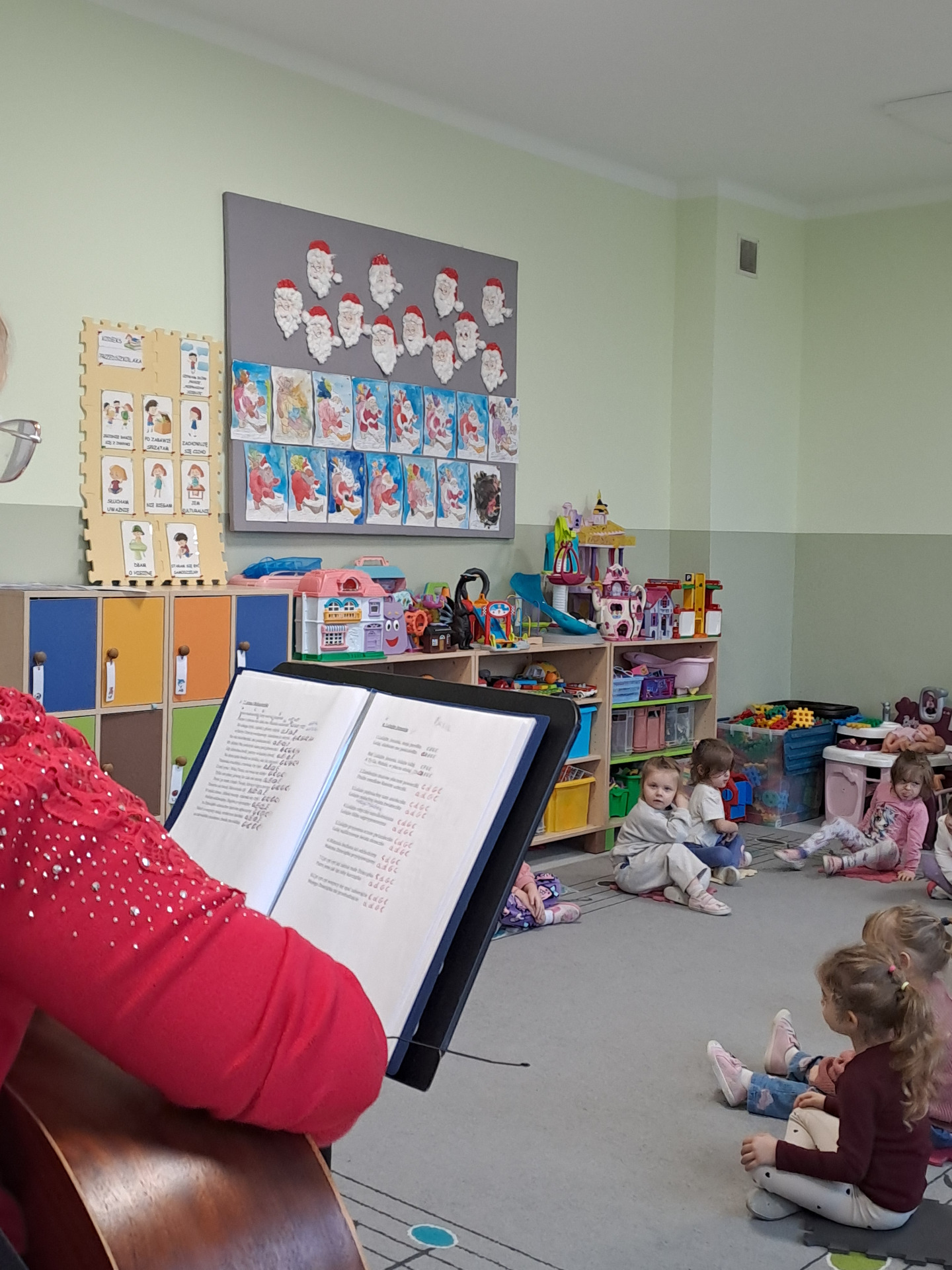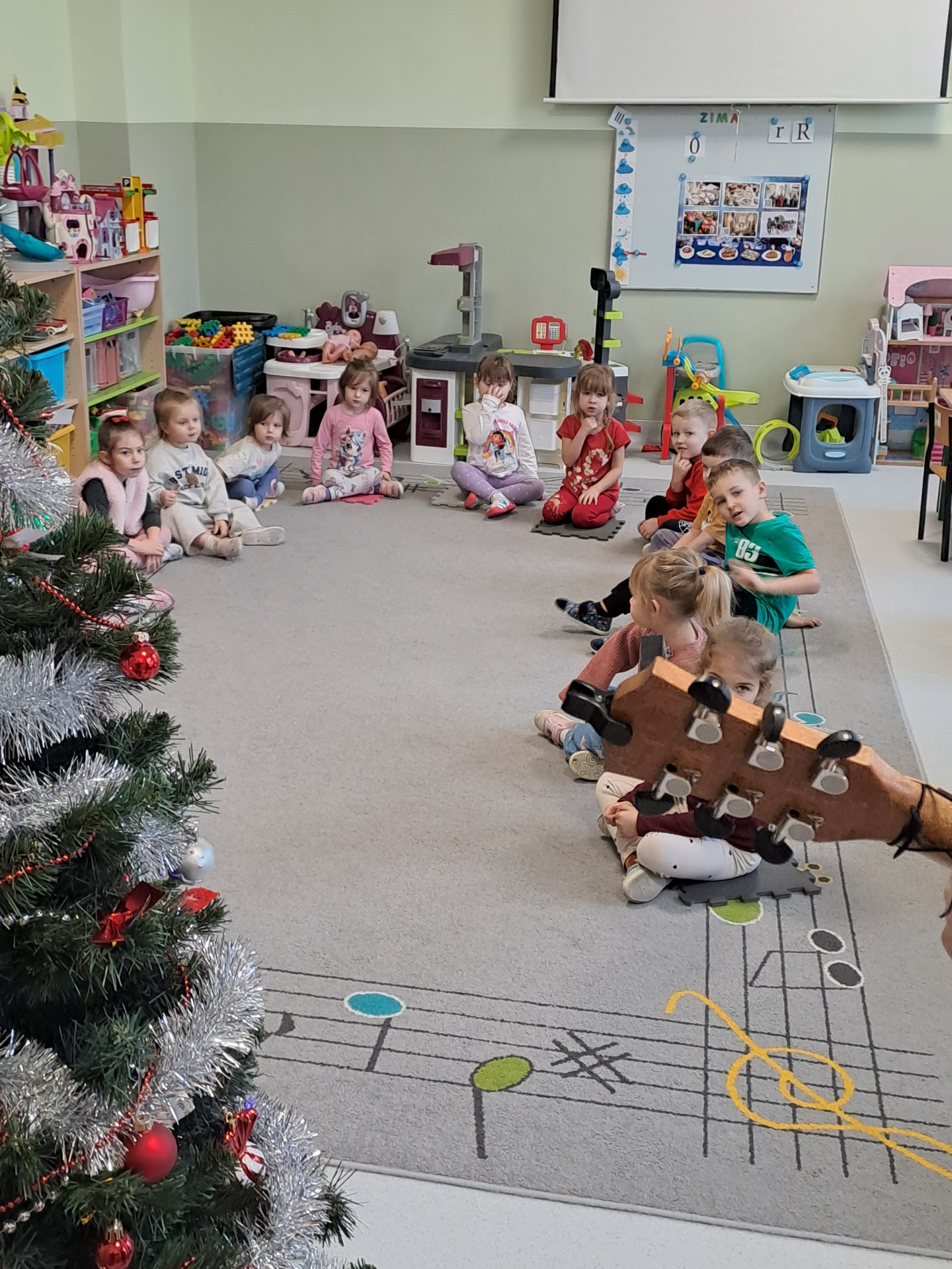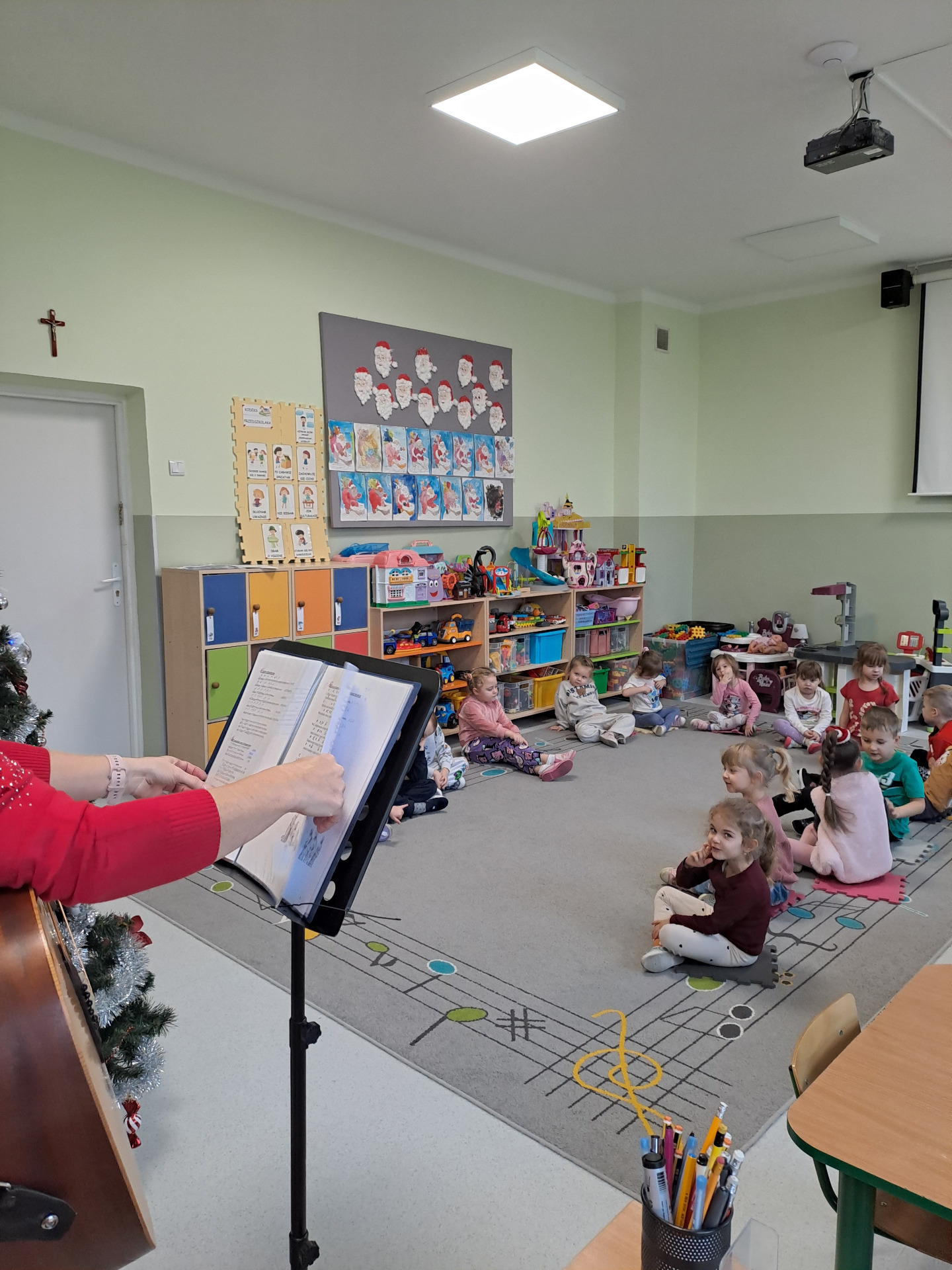 Dnia 16.12. 2025r. pani Hanna Mierzejewska odwiedziła dzieci z oddziału przedszkolnego "Biedronki", by przybliżyć im radosną atmosferę świąt. Nie zabrakło wspólnego śpiewania kolęd przy akompaniamencie gitary i i recytacji wierszy o tematyce bożonarodzeniowej.