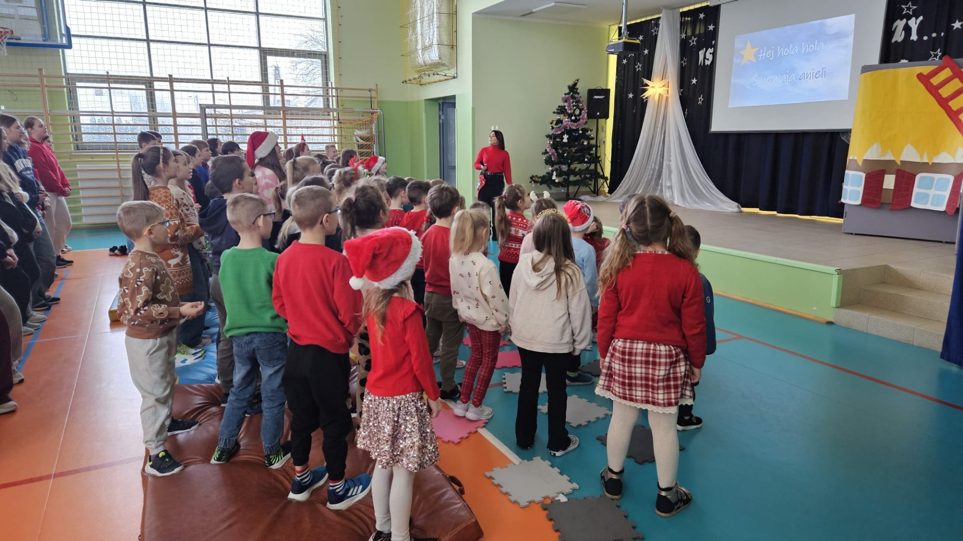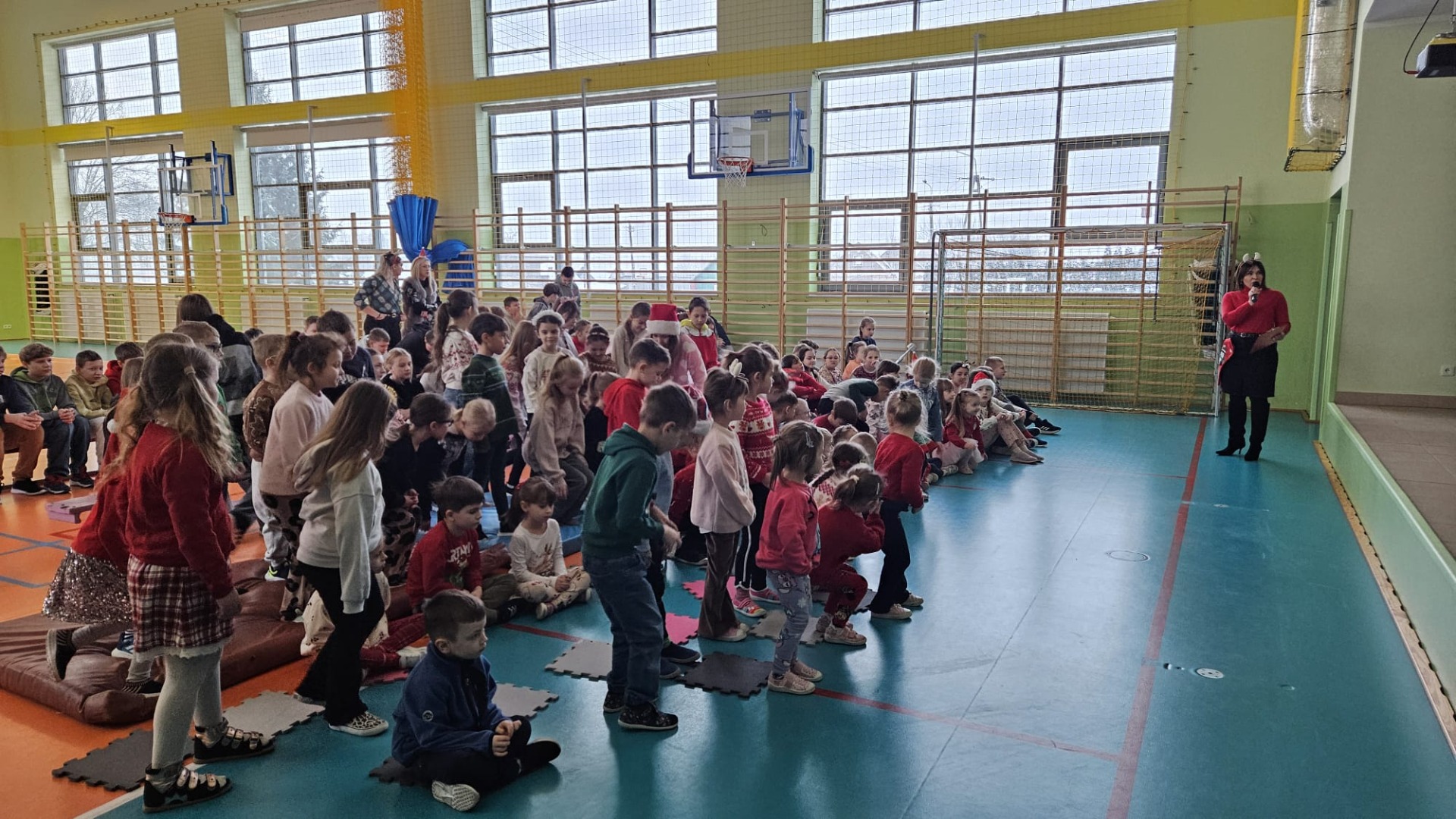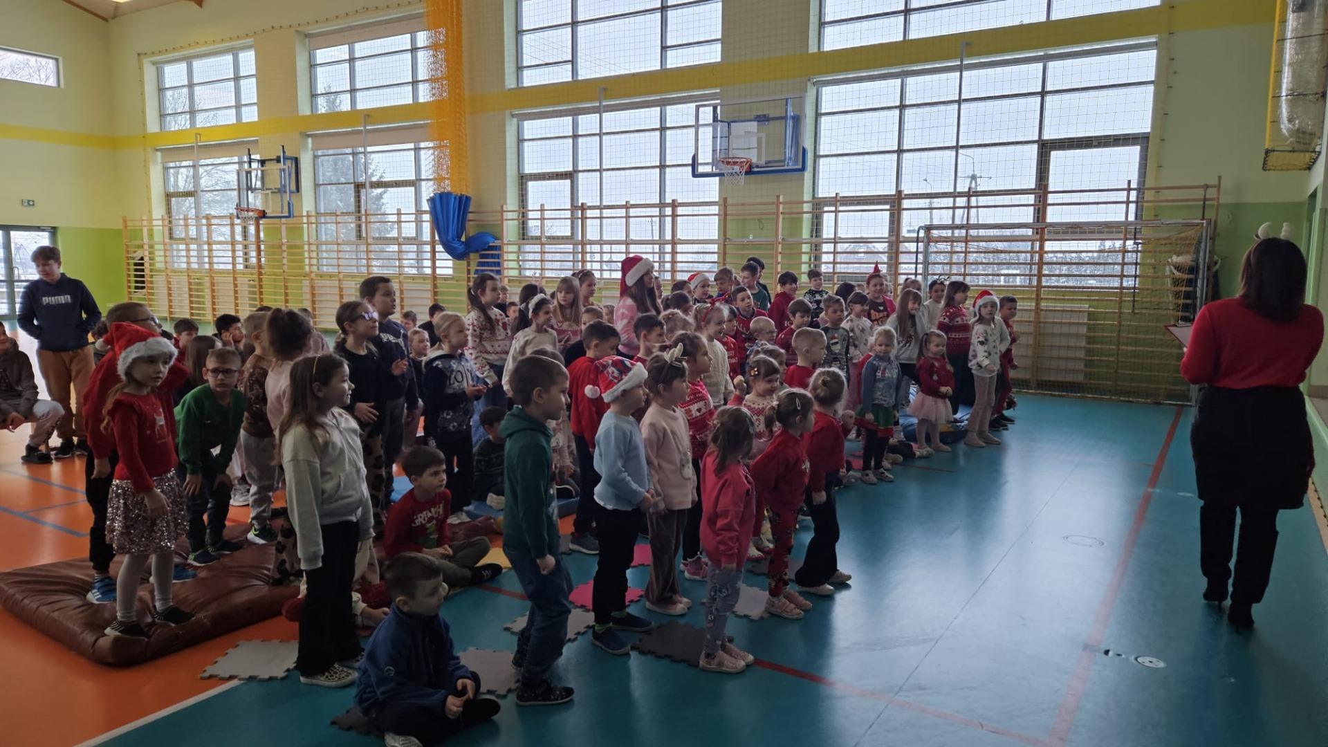 W dniu 12 stycznia o godz. 8.00 cała społeczność szkolna i przedszkolna wzięła udział w akcji „Szkolne kolędowanie”. Mimo mroźnej atmosfery na zewnątrz na sali gimnastycznej było wesoło i kolorowo. Uczniowie i nauczyciele ubrali się w kolory świąteczne i aktywnie uczestniczyli w zabawach muzycznych zorganizowanych przez prowadzącą – panią Joannę Karczewską. Wybrzmiały chórem najbardziej znane kolędy i pastorałki oraz te, które ulegają zapomnieniu. Nie zabrakło też piosenek świątecznych, które towarzyszą nam w okresie Świąt Bożego Narodzenia.